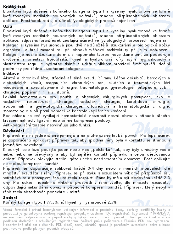 Bioaktivní krytí složené z koňského kolagenu typu I a kyseliny hyaluronové ve formě lyofilizovaných sterilních houbovitých polštářků, snadno přizpůsobitelných oblastem aplikace. Prostředek zesilující účinek fyziologických procesů hojení ran.