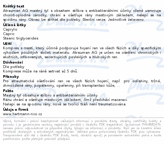 Atrauman AG mastný tyl s obsahem stříbra s antibakteriálními účinky cíleně usmrcuje choroboplodné zárodky, chrání a ošetřuje rány masťovým základem, nelepí se na spodinu rány. Obvaz lze stříhat dle potřeby. Sterilní verze. Jednotlivě zataveno.