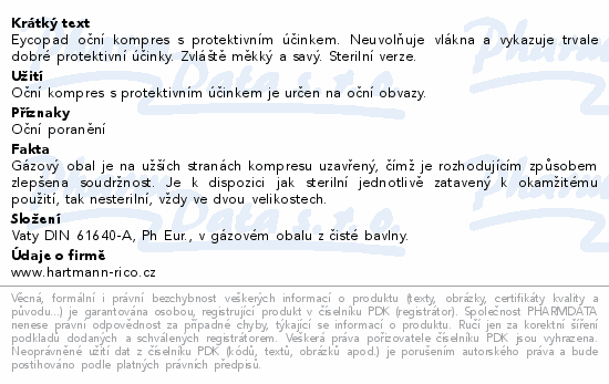 Eycopad oční kompres s protektivním účinkem. Neuvolňuje vlákna a vykazuje trvale dobré protektivní účinky. Zvláště měkký a savý. Sterilní verze.