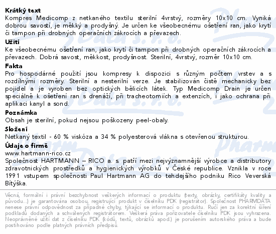 Kompres Medicomp z netkaného textilu sterilní 4vrstvý, rozměry 10x10 cm. Vyniká dobrou savostí, je měkký a prodyšný. Je určen ke všeobecnému ošetření ran, jako krytí či tampon při drobných operačních zákrocích a převazech.