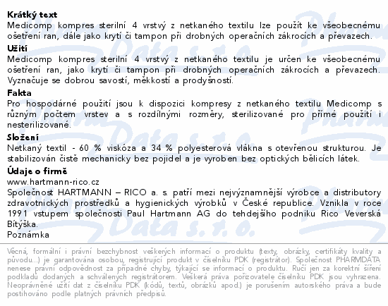 Medicomp kompres sterilní 4 vrstvý z netkaného textilu lze použít ke všeobecnému ošetření ran, dále jako krytí či tampon při drobných operačních zákrocích a převazech.