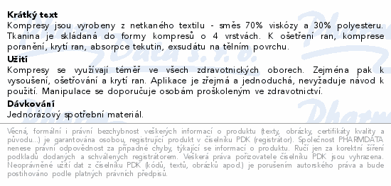 Kompresy jsou vyrobeny z netkaného textilu - směs 70% viskózy a 30% polyesteru. Tkanina je skládaná do formy kompresů o 4 vrstvách. K ošetření ran, komprese poranění, krytí ran, absorpce tekutin, exsudátu na tělním povrchu.