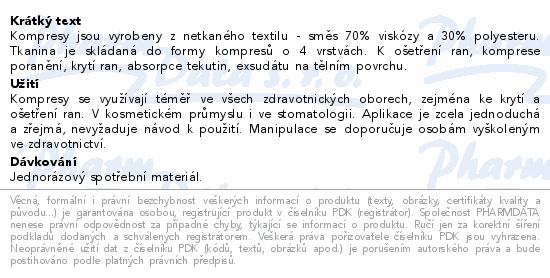 Kompresy jsou vyrobeny z netkaného textilu - směs 70% viskózy a 30% polyesteru. Tkanina je skládaná do formy kompresů o 4 vrstvách. K ošetření ran, komprese poranění, krytí ran, absorpce tekutin, exsudátu na tělním povrchu.