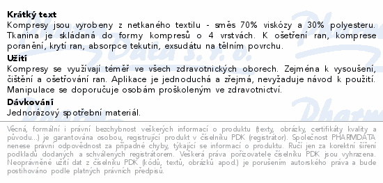Kompresy jsou vyrobeny z netkaného textilu - směs 70% viskózy a 30% polyesteru. Tkanina je skládaná do formy kompresů o 4 vrstvách. K ošetření ran, komprese poranění, krytí ran, absorpce tekutin, exsudátu na tělním povrchu.