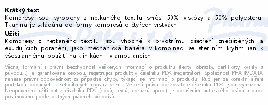 Kompresy jsou vyrobeny z netkaného textilu směsi 50% viskózy a 50% polyesteru. Tkanina je skládána do formy kompresů o čtyřech vrstvách.