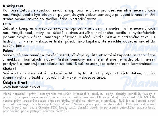 Kompres Zetuvit s vysokou savou schopností je určen pro ošetření silně secernujících ran. Vnější obal z hydrofobních polyamidových vláken zamezuje přilepení k ráně, vnitřní strana odvádí sekret do savého jádra. Nesterilní verze.
