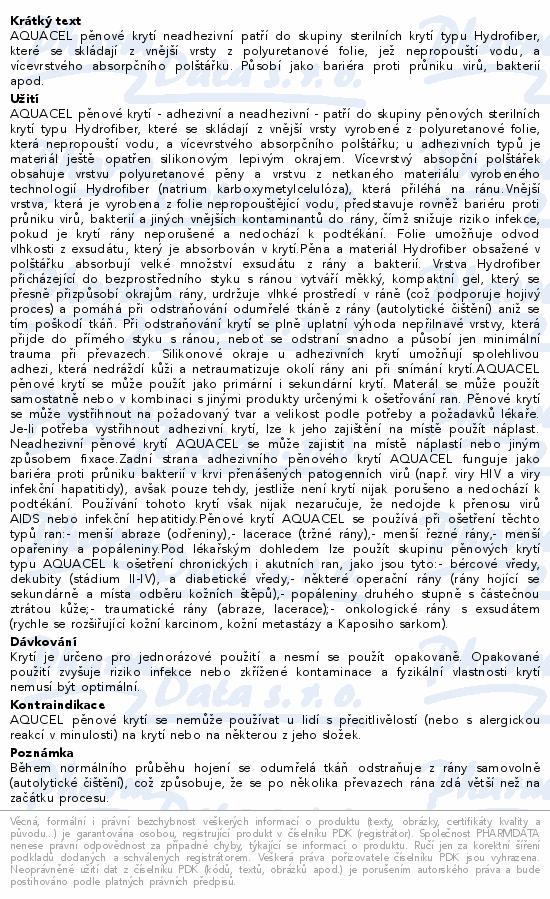 AQUACEL pěnové krytí neadhezivní patří do skupiny sterilních krytí typu Hydrofiber, které se skládají z vnější vrsty z polyuretanové folie, jež nepropouští vodu, a vícevrstvého absorpčního polštářku. Působí jako bariéra proti průniku virů, bakterií apod.