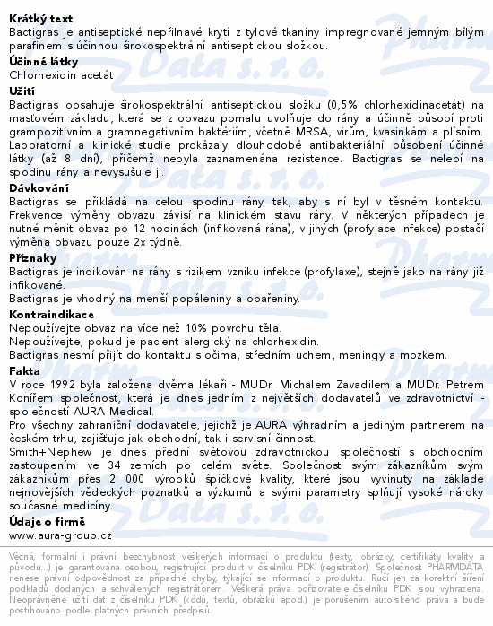 Bactigras je antiseptické nepřilnavé krytí z tylové tkaniny impregnované jemným bílým parafinem s účinnou širokospektrální antiseptickou složkou.