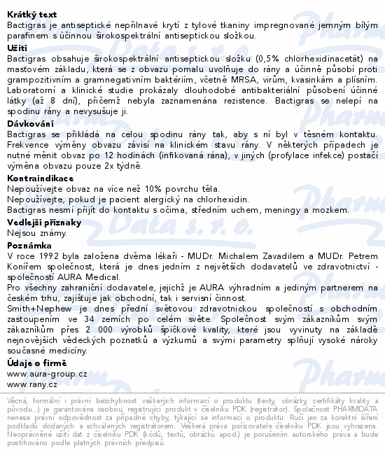 Bactigras je antiseptické nepřilnavé krytí z tylové tkaniny impregnované jemným bílým parafinem s účinnou širokospektrální antiseptickou složkou.