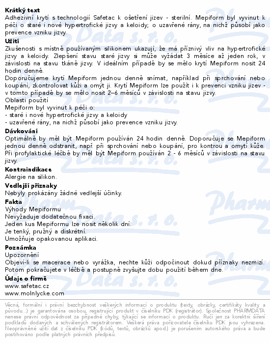Adhezivní krytí s technologií Safetac k ošetření jizev - sterilní. Mepiform byl vyvinut k péči o staré i nové hypertrofické jizvy a keloidy; o uzavřené rány, na nichž působí jako prevence vzniku jizvy.