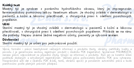 Mastný tyl je vyroben z porézního hydrofóbního obvazu, který je impregnován farmaceutickou pomocnou látkou Vaselinum album. Je vhodný zvláště v dermatologii u pacientů s kožní a lékovou přecitlivostí, v chirurgické praxi k ošetření povrchových popálenin.