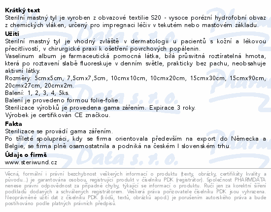 Sterilní mastný tyl je vyroben z obvazové textilie S20 - vysoce porézní hydrofobní obvaz z chemických vláken, určený pro impregnaci léčiv v tekutém nebo masťovém základu.