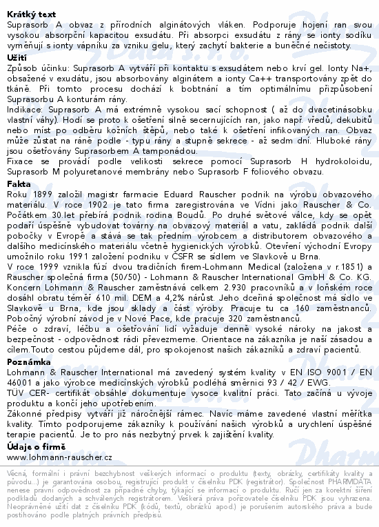 Suprasorb A obvaz z přírodních alginátových vláken. Podporuje hojení ran svou vysokou absorpční kapacitou exsudátu. Při absorpci exsudátu z rány se ionty sodíku vyměňují s ionty vápníku za vzniku gelu, který zachytí bakterie a buněčné nečistoty.