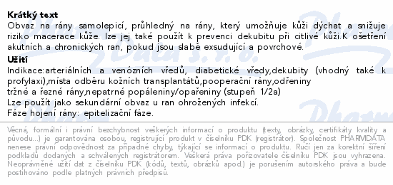 Obvaz na rány samolepicí, průhledný na rány, který umožňuje kůži dýchat a snižuje riziko macerace kůže. lze jej také použít k prevenci dekubitu při citlivé kůži.K ošetření akutních a chronických ran, pokud jsou slabě exsudující a povrchové.