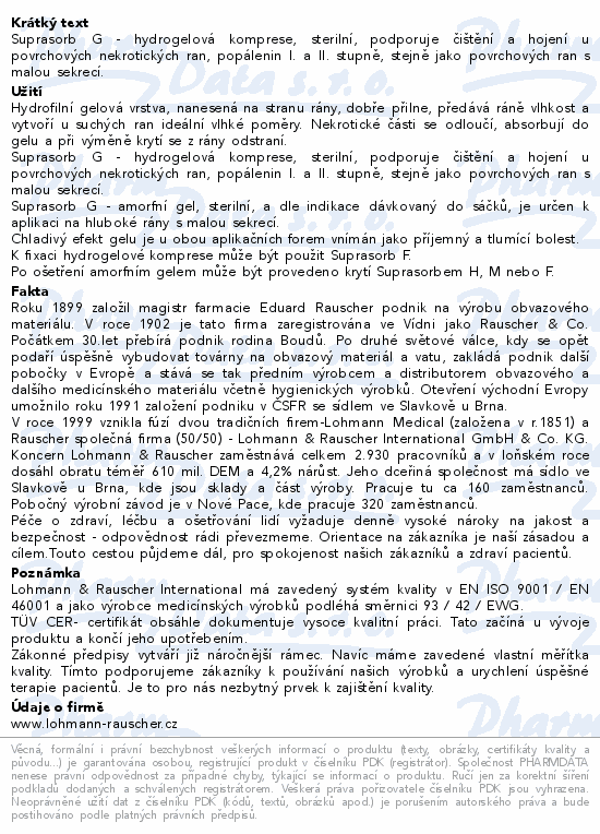 Suprasorb G - hydrogelová komprese, sterilní, podporuje čištění a hojení u povrchových nekrotických ran, popálenin I. a II. stupně, stejně jako povrchových ran s malou sekrecí.