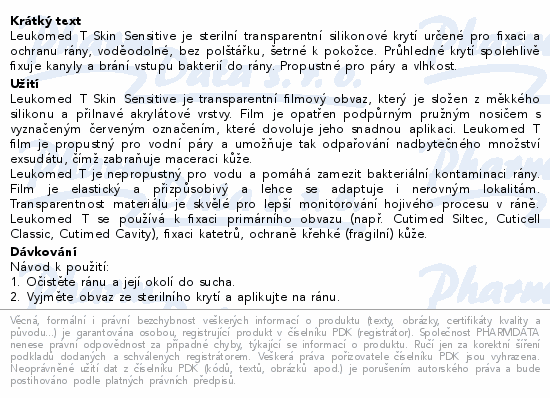 Leukomed T Skin Sensitive je sterilní transparentní silikonové krytí určené pro fixaci a ochranu rány, voděodolné, bez polštářku, šetrné k pokožce. Průhledné krytí spolehlivě fixuje kanyly a brání vstupu bakterií do rány. Propustné pro páry a vlhkost.
