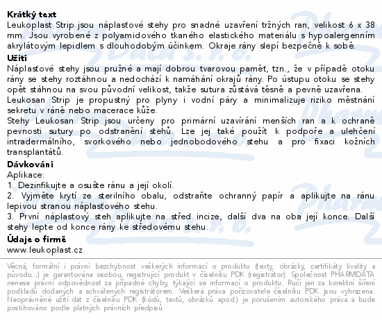 Leukoplast Strip jsou náplasťové stehy pro snadné uzavření tržných ran, velikost 6 x 38 mm. Jsou vyrobené z polyamidového tkaného elastického materiálu s hypoalergenním akrylátovým lepidlem s dlouhodobým účinkem. Okraje rány slepí bezpečně k sobě.