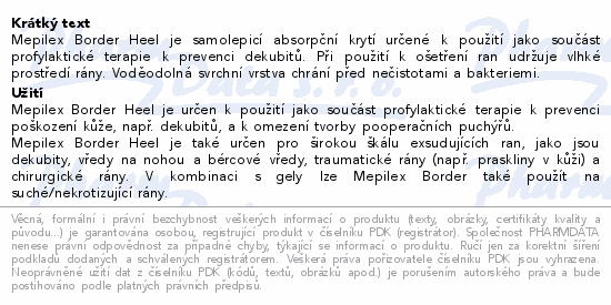 Mepilex Border Heel je samolepicí absorpční krytí určené k použití jako součást profylaktické terapie k prevenci dekubitů. Při použití k ošetření ran udržuje vlhké prostředí rány. Voděodolná svrchní vrstva chrání před nečistotami a bakteriemi.