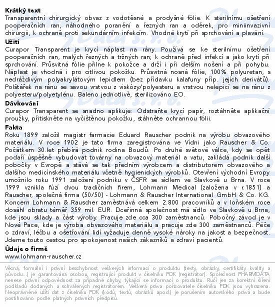 Transparentní chirurgický obvaz z vodotěsné a prodyšné fólie. K sterilnímu ošetření pooperačních ran, náhodného poranění a řezných ran a oděrek, pro miniinvazivní chirurgii, k ochraně proti sekundárním infekcím. Vhodné krytí při sprchování a plavání.
