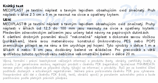 MEDIPLAST je textilní náplast s tavným lepidlem obsahujícím oxid zinečnatý. Pruh náplasti v šířce 2.5 cm x 5 m je navinut na cívce a opatřeny krytem.