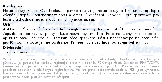 Nosní pásky 30 ks Questaplast - jemně rozevírají nosní cesty a tím umožňují lepší dýchání, zlepšují průchodnost nosu a omezují chrápání. Vhodné i pro sportovce pro lepší průchodnost nosu a dýchání při fyzické zátěžii.