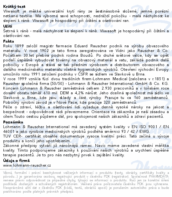 Vliwasoft je měkké univerzální krytí rány ze šestinásobně složené, jemně porézní netkané textilie. Má výborné savé schopnosti, nedráždí pokožku - malá náchylnost ke slepení k ráně. Vliwasoft je hospodárný při čištění a ošetřování ran.