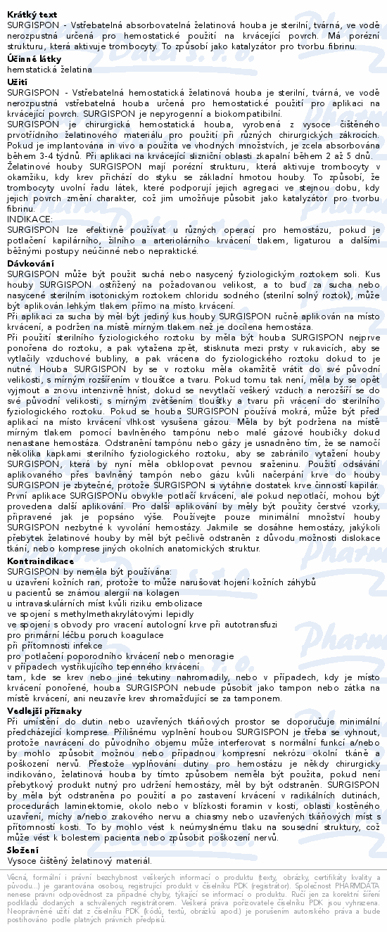 SURGISPON - Vstřebatelná absorbovatelná želatinová houba je sterilní, tvárná, ve vodě nerozpustná určená pro hemostatické použití na krvácející povrch. Má porézní strukturu, která aktivuje trombocyty. To způsobí jako katalyzátor pro tvorbu fibrinu.