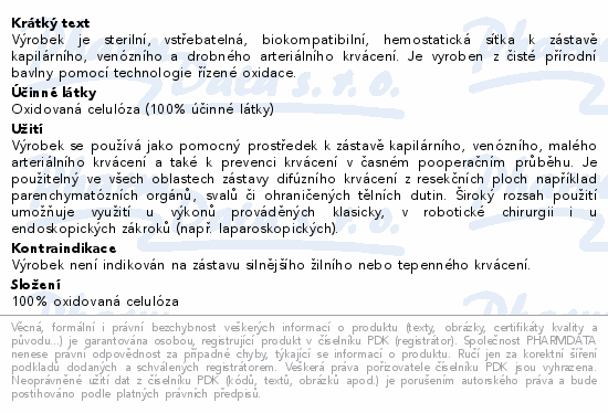 Výrobek je sterilní, vstřebatelná, biokompatibilní, hemostatická síťka k zástavě kapilárního, venózního a drobného arteriálního krvácení. Je vyroben z čisté přírodní bavlny pomocí technologie řízené oxidace.