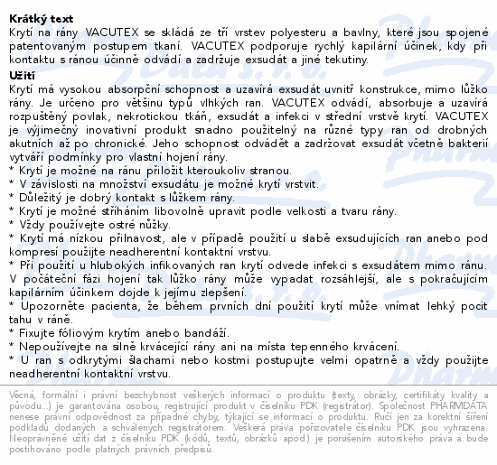 Krytí na rány VACUTEX se skládá ze tří vrstev polyesteru a bavlny, které jsou spojené patentovaným postupem tkaní. VACUTEX podporuje rychlý kapilární účinek, kdy při kontaktu s ránou účinně odvádí a zadržuje exsudát a jiné tekutiny.