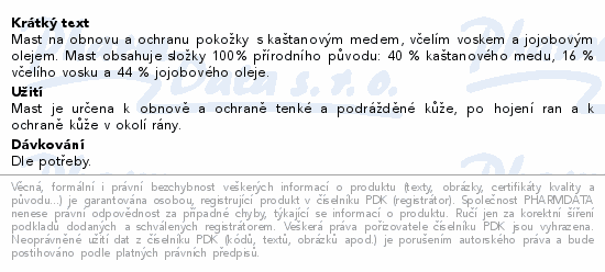 Mast na obnovu a ochranu pokožky s kaštanovým medem, včelím voskem a jojobovým olejem. Mast obsahuje složky 100% přírodního původu: 40 % kaštanového medu, 16 % včelího vosku a 44 % jojobového oleje.