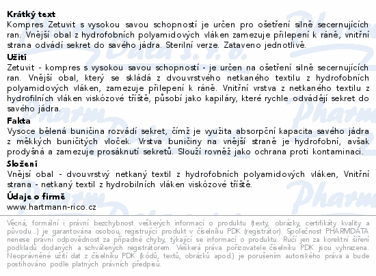 Kompres Zetuvit s vysokou savou schopností je určen pro ošetření silně secernujících ran. Vnější obal z hydrofobních polyamidových vláken zamezuje přilepení k ráně, vnitřní strana odvádí sekret do savého jádra. Sterilní verze. Zataveno jednotlivě.