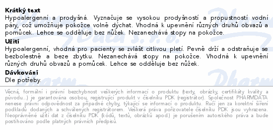 Hypoalergenní a prodyšná. Vyznačuje se vysokou prodyšností a propustností vodní páry, což umožňuje pokožce volně dýchat. Vhodná k upevnění různých druhů obvazů a pomůcek. Lehce se odděluje bez nůžek. Nezanechává stopy na pokožce.