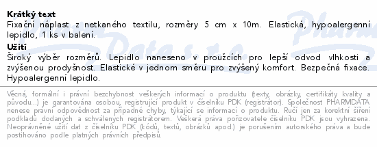 Fixační náplast z netkaného textilu, rozměry 5 cm x 10m. Elastická, hypoalergenní lepidlo, 1 ks v balení.