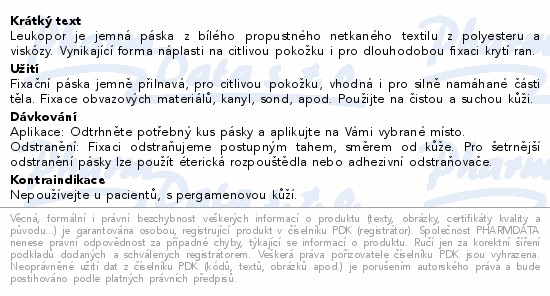 Leukopor - jemná páska z bílého propustného netkaného textilu z polyesteru a viskózy. Vynikající forma náplasti na citlivou pokožku i pro dlouhodobou fixaci krytí ran.