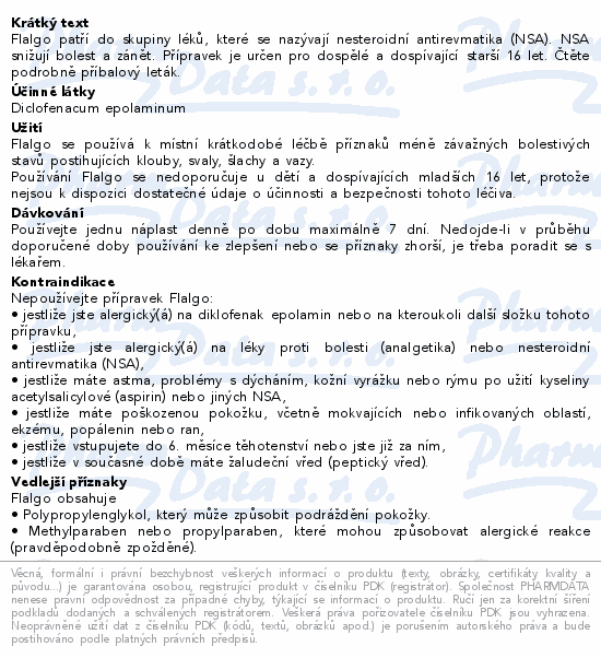 Flalgo patří do skupiny léků, které se nazývají nesteroidní antirevmatika (NSA). NSA snižují bolest a zánět. Přípravek je určen pro dospělé a dospívající starší 16 let. Čtěte pozorně příbalový leták.