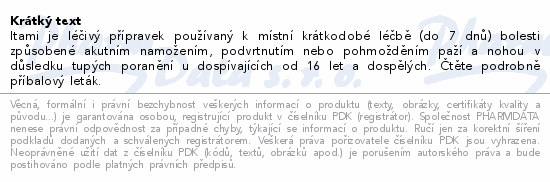 Itami je léčivý přípravek používaný k místní krátkodobé léčbě (do 7 dnů) bolesti způsobené akutním namožením, podvrtnutím nebo pohmožděním paží a nohou v důsledku tupých poranění u dospívajících od 16 let a dospělých. Čtěte pozorně příbalový leták.