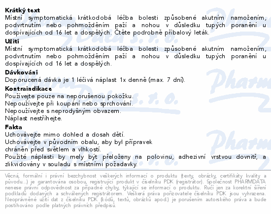 Místní symptomatická krátkodobá léčba bolesti způsobené akutním namožením, podvrtnutím nebo pohmožděním paží a nohou v důsledku tupých poranění u dospívajících od 16 let a dospělých. Čtěte pozorně příbalový leták.