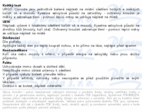 URGO Coricide jsou jednotlivě balené náplasti na místní ošetření tvrdých a měkkých kuřích ok a mozolů. Kyselina salicylová působí na zatvrdliny - ochranný kroužek je měkký a zabraňuje tření - pomocí lepící vrstvy se udržuje náplast na místě.