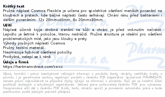 Pružná náplast Cosmos Flexible je určena pro spolehlivé ošetření menších poranění na kloubech a prstech, kde běžné náplasti často selhávají. Chrání ránu před bakteriemi i dalším poraněním. 12x 20mmx60mm, 8x 20mmx80mm.
