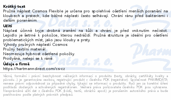 Pružná náplast Cosmos Flexible je určena pro spolehlivé ošetření menších poranění na kloubech a prstech, kde běžné náplasti často selhávají. Chrání ránu před bakteriemi i dalším poraněním.