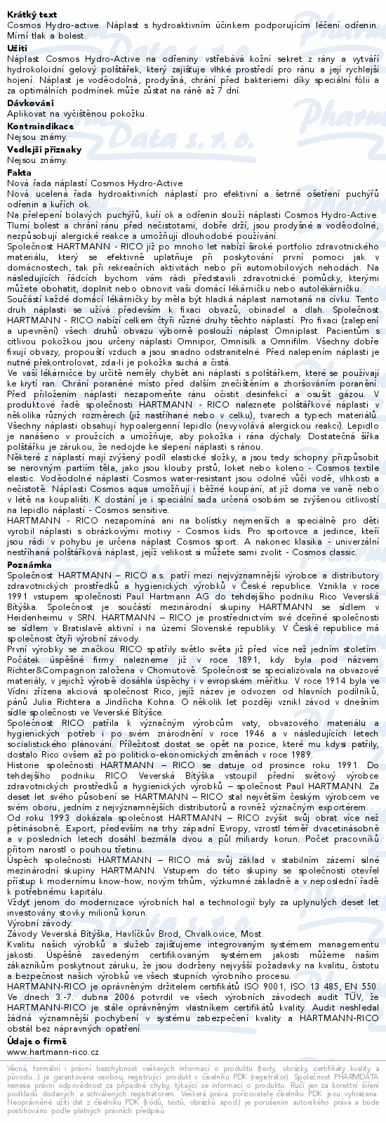 Cosmos Hydro-active. Náplast s hydroaktivním účinkem podporujícím léčení odřenin. Mírní tlak a bolest.