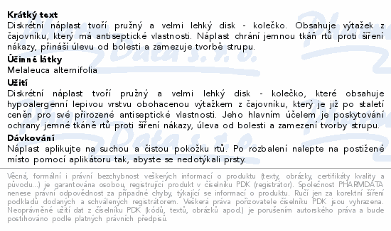 Diskrétní náplast tvoří pružný a velmi lehký disk - kolečko. Obsahuje výtažek z čajovníku, který má antiseptické vlastnosti. Náplast chrání jemnou tkáň rtů proti šíření nákazy, přináší úlevu od bolesti a zamezuje tvorbě strupu.