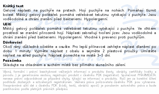 Gelové náplasti na puchýře na prstech. Hojí puchýře na nohách. Pomáhají tlumit bolest. Měkký gelový polštářek pomáhá vstřebávat tekutinu vytékající z puchýře. Jsou voděodolné a chrání zranění před bakteriemi. Hypolergenní.