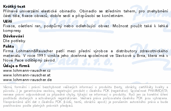 Přilnavé univerzální elastické obinadlo. Obinadlo se středním tahem, pro znehybnění částí těla, fixace obvazů, dobře sedí a přizpůsobí se končetinám.