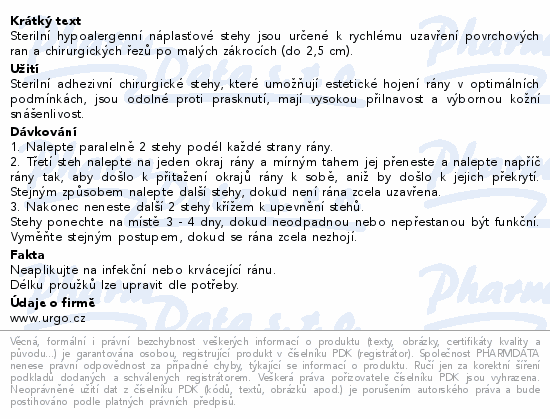 Sterilní hypoalergenní náplasťové stehy jsou určené k rychlému uzavření povrchových ran a chirurgických řezů po malých zákrocích (do 2,5 cm).