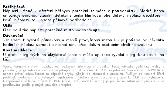 Náplasti určené k ošetření běžných poranění zejména v potravinářství. Modrá barva umožňuje snadnou vizuální detekci a tenká hliníková fólie detekci náplasti detektorem kovů. Náplasti jsou vysoce přilnavé, voděodolné.