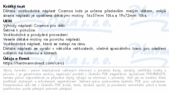 Dětská voděodolná náplast Cosmos kids je určena především malým dětem, vnější strana náplasti je opatřena dětskými motivy. 16x57mm 10ks a 19x72mm 10ks.