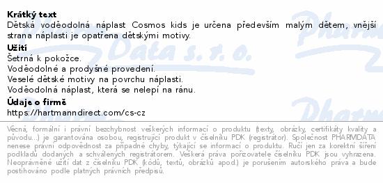 Dětská voděodolná náplast Cosmos kids je určena především malým dětem, vnější strana náplasti je opatřena dětskými motivy.