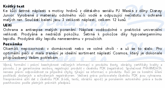 Ke kůži šetrné náplasti s motivy hrdinů z dětského seriálu PJ Masks z dílny Disney Junior. Vyrobené z materiálu odolného vůči vodě a odpuzující nečistotu k ochraně malých ran. Součástí balení jsou 3 velikosti náplastí, celkem 12 kusů.