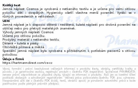 Jemná náplast Cosmos je vyrobená z netkaného textilu a je určena pro velmi citlivou pokožku dětí i dospělých. Hygienicky ošetří všechna menší poranění. Vyrábí se v různých provedeních a velikostech.